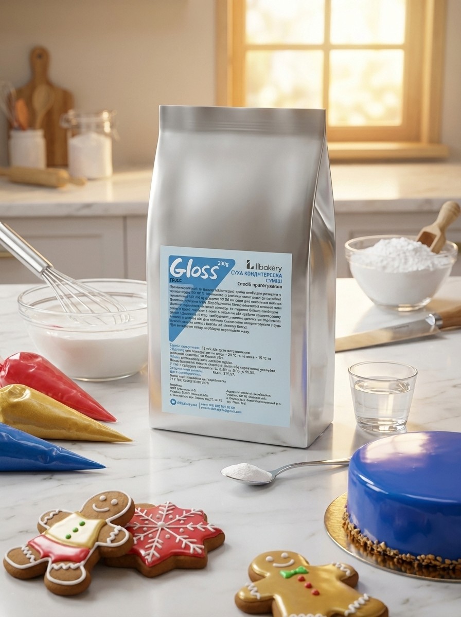 ЗАСТОСУВАННЯ: для нанесення контурів, мережива, тексту. На 100 г основи додати 0,5-1 чайну ложку Gloss. Для отримання більш пластичної текучої маси глазурі додайте сухий порошок в айсинг або зробіть концентровану суміш і додавайте в міру необхідності невеликими дозами до отримання блиску в заливці або для пайпінгу.