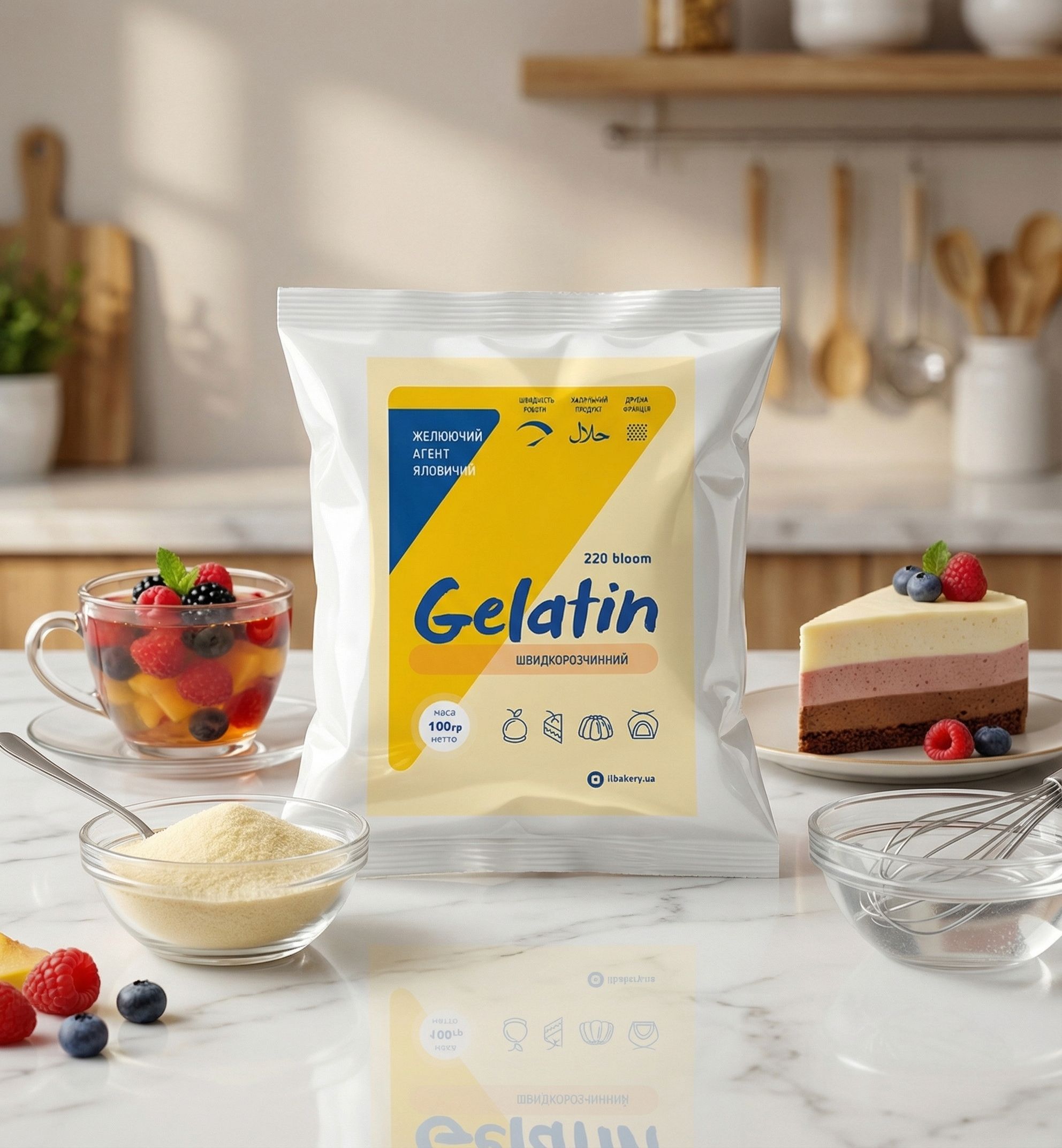 ЖЕЛАТИН – говяжий желирующий агент. Используется для стабилизации всех видов жидкостей от фруктовых соков до молочных желе, мясных и рыбных блюд в кулинарии.